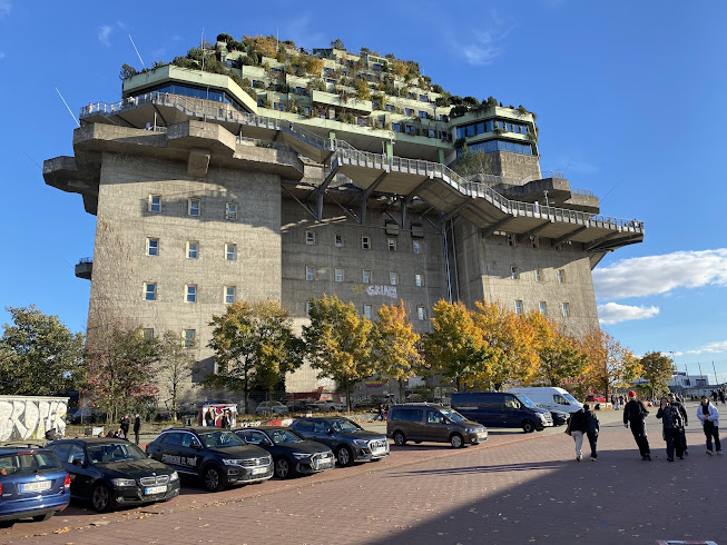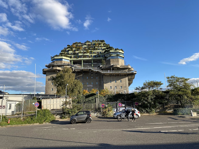 En eller annen gang i nær fortid, kom tydeligvis noen på at «vi må finne på noe med detta triste greiene», så nå når jeg var i Hamburg for å kikke på den fikk jeg nesten sjokk. Nå var det blitt en severdighet, bla med leiligheter, konsertlokale og klatrepark og mye annet. Og de har bygd den ut! I høyde og bredde! For en puritaner som helst ville ha sett flaktårnet i all sin prakt, så var det horribelt, men som bygg var det blitt kult! Og folk sto i lang kø for å gå opp den lange veien som var bygd rundt tårnet. Jeg hadde ikke ork til å stå i kø. Jeg var tross alt på vei til konsert, så det ble bare ei runde rundt for å kikke på bakkenivå. Det er god plass til parkering der ved foten. Bla en bobilparkering så det ut til. På andre siden av gaten var det bruktmarked. Det så nesten ut til at dette var vanlig her.